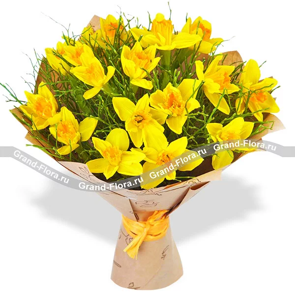 Стандартный: нарциссы желтые - 25 шт., декоративная зелень, упаковка крафт, лента.